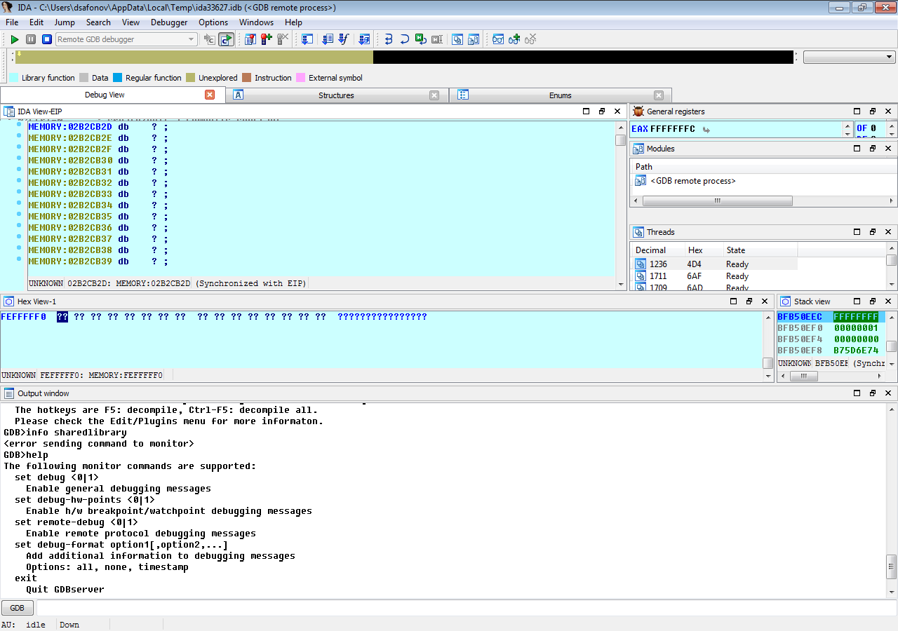 Второй успешно запускается, делаю форвард порта, но IDA не может корректно подключиться: подключается, видит список запущенных процессов на андроиде и при попытке подключиться к выбранному процессу получает отлуп: