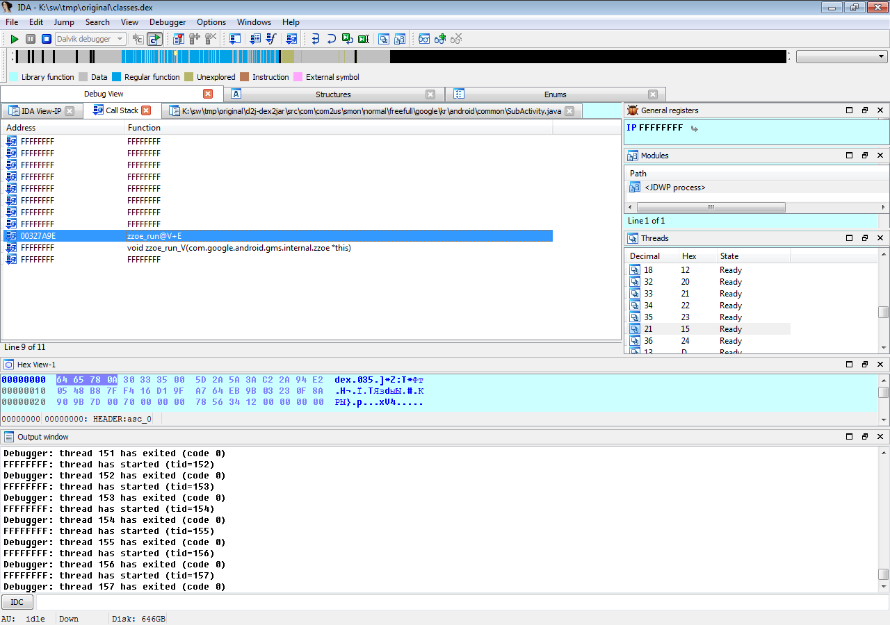 1ый способ. сразу при старте IDA pro загрузить apk, и далвик дебаггером запустить его на эмуляторе nox. Приложение успешно запускается на эмуляторе, отладчиком могу что-то пошагово выполнять, но как добраться до нужной мне so библиотеки? Тем более приложение постоянно создает/завершает новые параллельные процессы