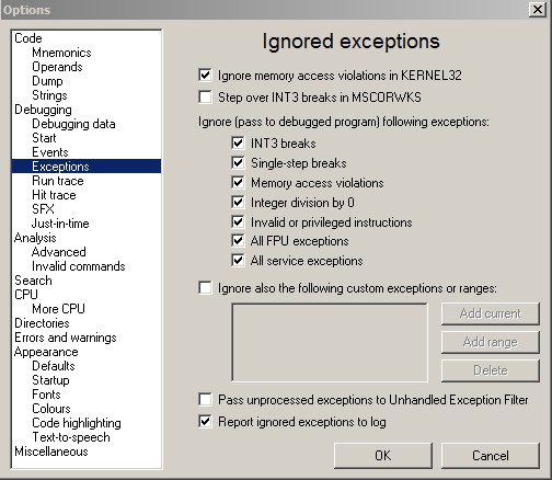 собственно логика понятна, выделяем кусок памяти, делаем PAGE_GUARD и вызываем его, делая исключение. Вопрос: как попасть на обработчик прерывания, который устанавливается программой? я делал так: ставлю аппаратную точку останова на обработчик (00404B00), затем в ольке отключаю обработку всех исключений, F9 и олька все равно стопорится на вызове CALL DWORD PTR SS:[LOCAL.8]. Не вопрос, думаю я, затем иду на обработчик и New origin here, но какаказалось на стеке нет информации об исключении и все уходит в небытие... Как побороть? скрин настроек олиCode:CPU Disasm Address Hex dump Command Comments 0040B960 /$ 55 PUSH EBP ; Abduction_Crackme_new.0040B960(guessed void) 0040B961 |. 8BEC MOV EBP,ESP 0040B963 |. 6A FE PUSH -2 0040B965 |. 68 60F94000 PUSH OFFSET 0040F960 0040B96A |. 68 004B4000 PUSH 00404B00 0040B96F |. 64:A1 0000000 MOV EAX,DWORD PTR FS:[0] 0040B975 |. 50 PUSH EAX 0040B976 |. 83C4 EC ADD ESP,-14 ; тут еще немного всякой чепухи 0040B9AE |. 6A 04 PUSH 4 ; /Protect = PAGE_READWRITE 0040B9B0 |. 68 00100000 PUSH 1000 ; |AllocType = MEM_COMMIT 0040B9B5 |. 68 00000100 PUSH 10000 ; |Size = 65536. 0040B9BA |. 6A 00 PUSH 0 ; |Address = NULL 0040B9BC |. 8B35 30E04000 MOV ESI,DWORD PTR DS:[<&KERNEL32.Virtual ; | 0040B9C2 |. FFD6 CALL ESI ; \KERNEL32.VirtualAlloc 0040B9C4 |. 8945 E0 MOV DWORD PTR SS:[LOCAL.8],EAX 0040B9C7 |. C600 C3 MOV BYTE PTR DS:[EAX],0C3 0040B9CA |. 8945 E0 MOV DWORD PTR SS:[LOCAL.8],EAX 0040B9CD |. FF75 DC PUSH DWORD PTR SS:[LOCAL.9] ; /pOldProtect => [LOCAL.9] 0040B9D0 |. 68 20010000 PUSH 120 ; |NewProtect = PAGE_EXECUTE_READ|PAGE_GUARD 0040B9D5 |. 6A 10 PUSH 10 ; |Size = 16. 0040B9D7 |. 50 PUSH EAX ; |Address 0040B9D8 |. 8B35 3CE04000 MOV ESI,DWORD PTR DS:[<&KERNEL32.Virtual ; | 0040B9DE |. FFD6 CALL ESI ; \KERNEL32.VirtualProtect 0040B9E0 |. FF55 E0 CALL DWORD PTR SS:[LOCAL.8]
